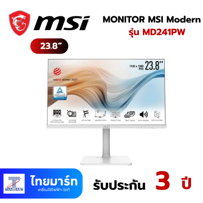 จอมอนิเตอร์ MSI Modern MD241 Series - ขนาด 23.8 นิ้ว, Full HD, Less Blue Light แสงสีฟ้าน้อย, Anti-Flicker ป้องกันการสั่นไหว, Anti-Glare ป้องกันแสงสะท้อน, โปรแกรมปรับแต่งการแสดงผล Display Kit ชุดคิทของจอ, รองรับตัวยึด VESA มาพร้อมลำโพงในตัว ออกแบบมาเพื่อการออกแบบที่หรูหราและเป็นส่วนตัวในทุกที่ของตัวบ้านของคุณ และการเรียนรู้อย่างมีประสิทธิในสังคมปัจจุบัน ยังได้รับรางวัลการออกแบบระดับโลกจาก Red Dot Design Award 2021