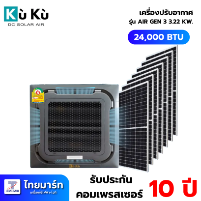 KUKU Air Gen 3 มีแอร์แบบฝังฝ้าแล้วนะ รุ่นใหม่แกะกล่องเลย CASSETTE TYPE 24,000 BTU พร้อมแผงโซล่าเซลล์ 3.22 KW แอร์ฝังฝ้าพลังโซล่าเซลล์จาก “KuKu DC Solar Air” สีเทาแลมโบสุดเท่ ประหยัดไฟเหมือนเดิม เพิ่มเติมคือความเรียบหรู เพื่อความคูลสำหรับทุกที่ และทุกธุรกิจของคุณ ไม่ว่าจะเป็นบ้าน, คาเฟ่, โรงแรม, ออฟฟิต, ห้องประชุม, ร้านอาหาร หรือกิจการขนาดใหญ่ต่างๆ ติดแอร์ฝังฝ้า Kuku ไม่มีหลุดธีม ใช้พลังงานแสงอาทิตย์ ไม่ทำลายสิ่งแวดล้อม เป็นมิตรต่อโลก แถมลดภาวะก๊าซเรือนกระจกอีกด้วย