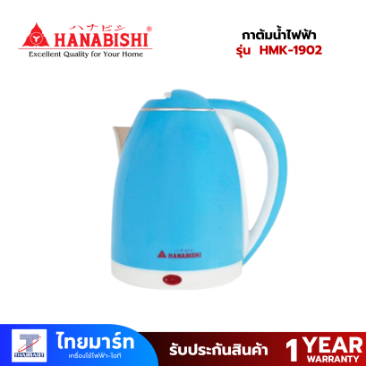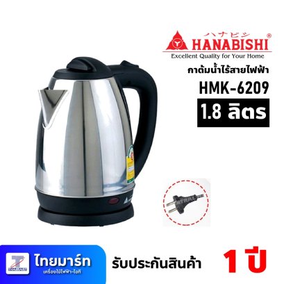 กาต้มน้ำไร้สายไฟฟ้า ขนาด 1.8ลิตร ยี่ห้อ Hanabishi รุ่น HMK-6209 (เครื่องศูนย์ไทย รับประกัน 1ปี) กาต้มน้ำแบบไร้สาย ขนาดความจุ 1.8ลิตร กำลังไฟ 1500วัตต์ วัสดุผลิตจากสแตนเลสแท้มันวาวสวยงาม ไม่เป็นสนิม ทำความสะอาดง่าย ที่กรองกากชา กาแฟ สามารถถอดออกทำความสะอาดได้ และควบคุมอุณหภูมิด้วยเทอร์โมสตัท โดยน้ำจะเดือดภายใน 6นาที ที่จุดเดือด 100 องศาเซลเซียส มีสัญญาณไฟแสดงการทำงาน มีระบบล็อคฝาปิดเพื่อป้องกันน้ำร้อนกระเด็นขณะเดือดได้รับการรับรองฉลากประหยัดไฟเบอร์ 5