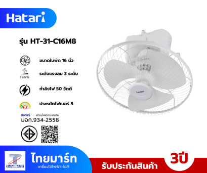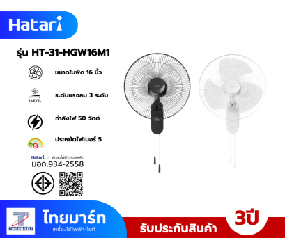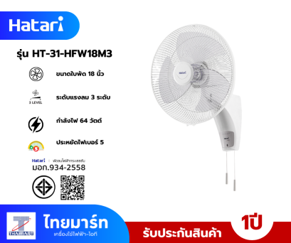 สัมผัสความผ่อนคลายของสายลมที่ทำให้ เย็นกาย สบายใจ ไปกับพัดลมติดผนัง HATARI ด้วยใบพัด 3 แฉก กระจายลมทั่วถึงสม่ำเสมอทุกมุมห้อง ปรับความแรงได้ถึง 3 ระดับ ควบคุมการใช้งานด้วยเชือกควบคุม 2 เส้น แถมยังปลอดภัย ด้วยระบบตัดไฟอัตโนมัติเมื่อมอเตอร์ร้อนเกินไป รวมถึงยังผ่านมาตรฐาน มอก. ให้คุณมั่นใจในความปลอดภัยไร้กังวล