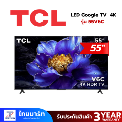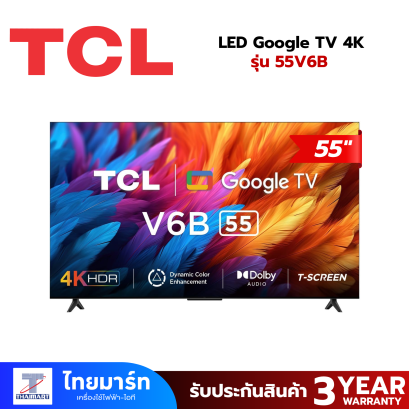 TCL LED Google TV 4K รุ่น 55V6B สมาร์ททีวีขนาด 55 นิ้ว 4K UHD Resolution 3840 x 2160 CPU : A55*4 1.3GHz GPU : G311*2 800MHz เห็นทุกรายละเอียด สีสันสดใส ตามภาพจริงด้วย เทคโนโลยี 4K UHD HDR และ Dynamic Color Enchancement ชิปประมวลผล AiPQ Engine 3.0 enabled TCL algorithm โหลดแอพได้เยอะขึ้น