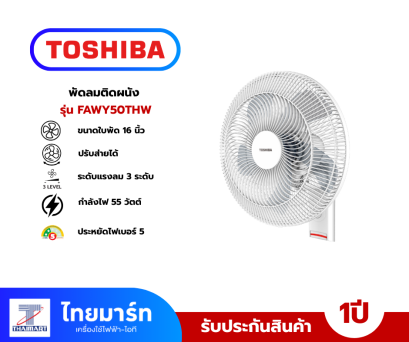 สัมผัสความเย็นที่คุณต้องการด้วยพัดลมติดผนัง TOSHIBA ขนาด 16 นิ้ว ที่ให้กำลังไฟ 55 Watt สร้างลมแรงจุใจ ด้วยใบพัด 5 ใบ ที่ออกแบบมาเพื่อส่งลมเย็นได้ไกลและแรงยิ่งขึ้น พร้อมตะแกรงแบบพิเศษเกลียวโค้งสองระดับ ทำให้คุณรู้สึกสดชื่นทุกช่วงเวลาของวัน! ให้คุณมั่นใจในความปลอดภัยด้วยมาตรฐาน มอก. และการทำงานที่เงียบสนิทด้วยมอเตอร์บอลแบริ่ง ทนทาน ใช้งานได้ยาวนาน ไม่ว่าจะตั้งในห้องนอนหรือห้องนั่งเล่น บ้านของคุณจะเต็มไปด้วยความเย็นสบายตลอดทั้งวัน!