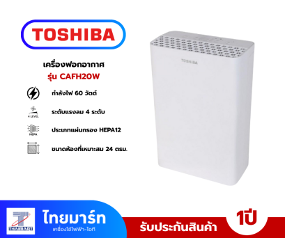 Toshiba เครื่องฟอกอากาศ PM2.5 24ตรม.รุ่น CAF-H20(W) เหมาะกับห้องขนาด 24 ตร.ม. ปล่อยไอออนประจุลบ เพื่อดักจับฝุ่นในอากาศ ชุดกรองอากาศพิเศษ 3 ชั้น Pre-Filter + HEPA + CARBON ฟอกเร็วทันใจ ปรับความแรงได้ 4 ระดับ กรองอากาศในห้องได้อย่างรวดเร็วจ เต็มประสิทธิภาพ