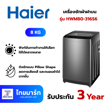 HAIER เครื่องซักผ้าฝาบน 8 Kg.สีเทาเข้ม รุ่นHWM80-316S6 Quick Wash : ซักด่วน 12 นาที ประหยัดเวลา ประหยัดพลังงาน Soft Closing Door : ฝาปิดถังซักผลิตจากกระจกนิรภัย คุณภาพสูง และปิดได้โดยไม่มีการกระแทก ABT Pulsator : จานซักเคลือบสารป้องกันแบคทีเรีย เพื่อป้องกันแบคทีเรียตกค้างได้ถึง 99.99% Auto Restart : ทำงานต่อเนื่องเมื่อมีกระแสไฟดับหรือไฟตก ก็สามารถเปิดใช้งานต่อได้ทันที รับประกันมอเตอร์ 12 ปี , รับประกันตัวเครื่อง 3 ปี