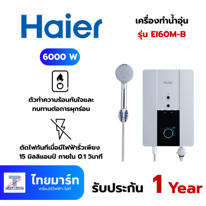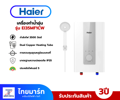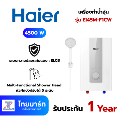 HAIER เครื่องทำน้ำอุ่น4,500W ตัดไฟอัตโนมัติ รุ่นEI45M-F1CW - หมายเลขมอก.1693-2547 - มาตรฐานเกรดกันน้ำ : IP25 - ขนาดเครื่อง 21.0 x 35.0 x 7.8 cm - น้ำหนักตัวเครื่อง 1.67 kg - สี ขาว-เทา - อุณหภูมิน้ำออกสูงสุด 50 องศาเซลเซียส - ระบบตัดความปลอดภัย ELCB