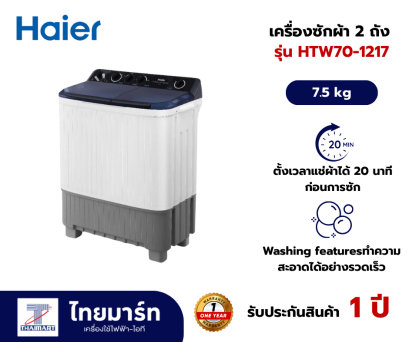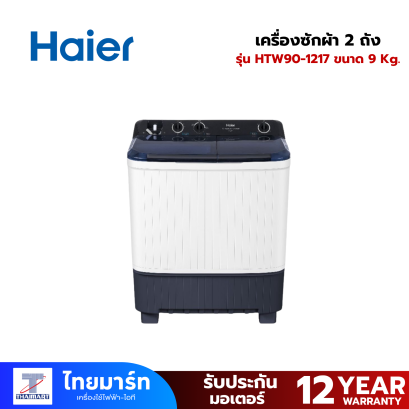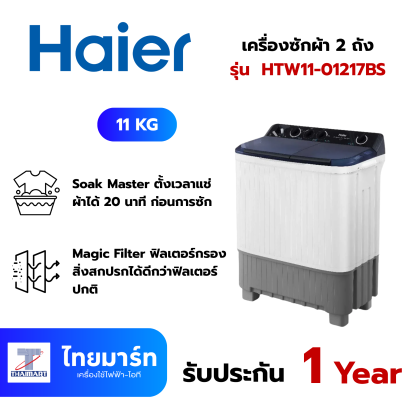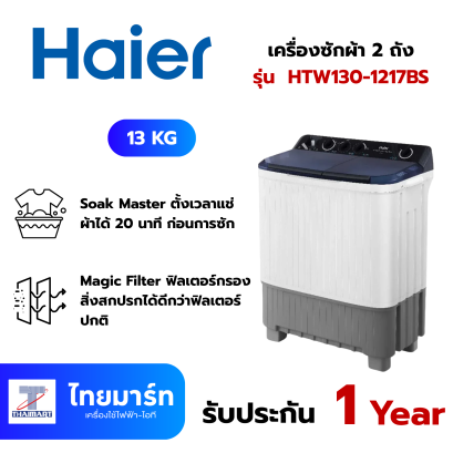HAIER เครื่องซักผ้า 2 ถัง 13kg รุ่น HTW130-1217BS Soak Master ตั้งเวลาแช่ผ้าได้ 20 นาที ก่อนการซัก Shower Rinse ม่านน้ำตกภายในถังปั่นแห้ง ช่วยล้าง ทำให้ผ้าสะอาดมากขึ้น Magic Filter ฟิลเตอร์กรองสิ่งสกปรกได้ดีกว่าฟิลเตอร์ปกติ รับประกันมอเตอร์ 12 ปี, รับประกันอะไหล่ 1 ปี