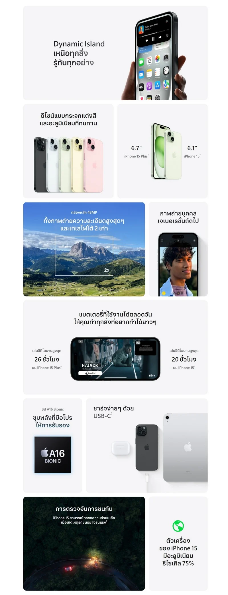 iPhone 15 Dynamic Island มาอยู่บน iPhone 15 แล้วทำให้คุณไม่พลาดเรื่องราวต่าง ๆ เสริมด้วยกล้องหลัก 48 MP ถ่ายภาพที่มีความละเอียดสูงได้แบบง่าย ๆ ทั้งยังมีเทเลโฟโต้ 2 เท่าอีกด้วย และเปลี่ยนช่องเชื่อมต่อเป็น USB-C มาในดีไซน์แบบกระจกแต่งสีและอะลูมิเนียมที่ทนทาน