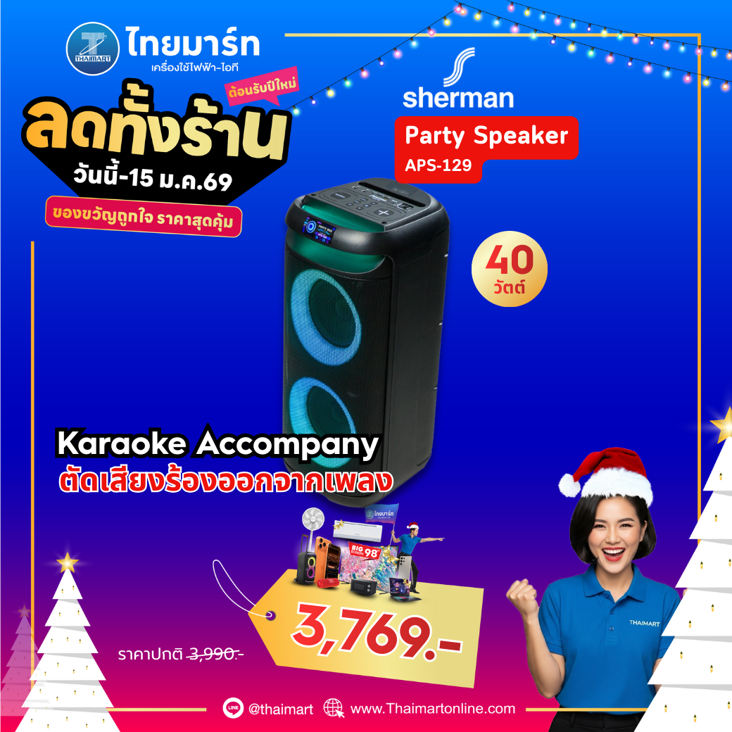 Sherman APS-129 ลำโพงบลูทูธพกพาอเนกประสงค์ ขนาด 8 นิ้ว 2 ดอก แอมป์ในตัว 40 วัตต์ (RMS) รองรับการเชื่อมต่อ Bluetooth เปิดเพลงผ่าน USB และ SD Card ได้ มาพร้อมไมโครโฟนไร้สายแบบถือ 1 ตัว เหมาะสำหรับงานสังสรรค์ งานพูด ทั้งใน Indoor หรือ Outdoor