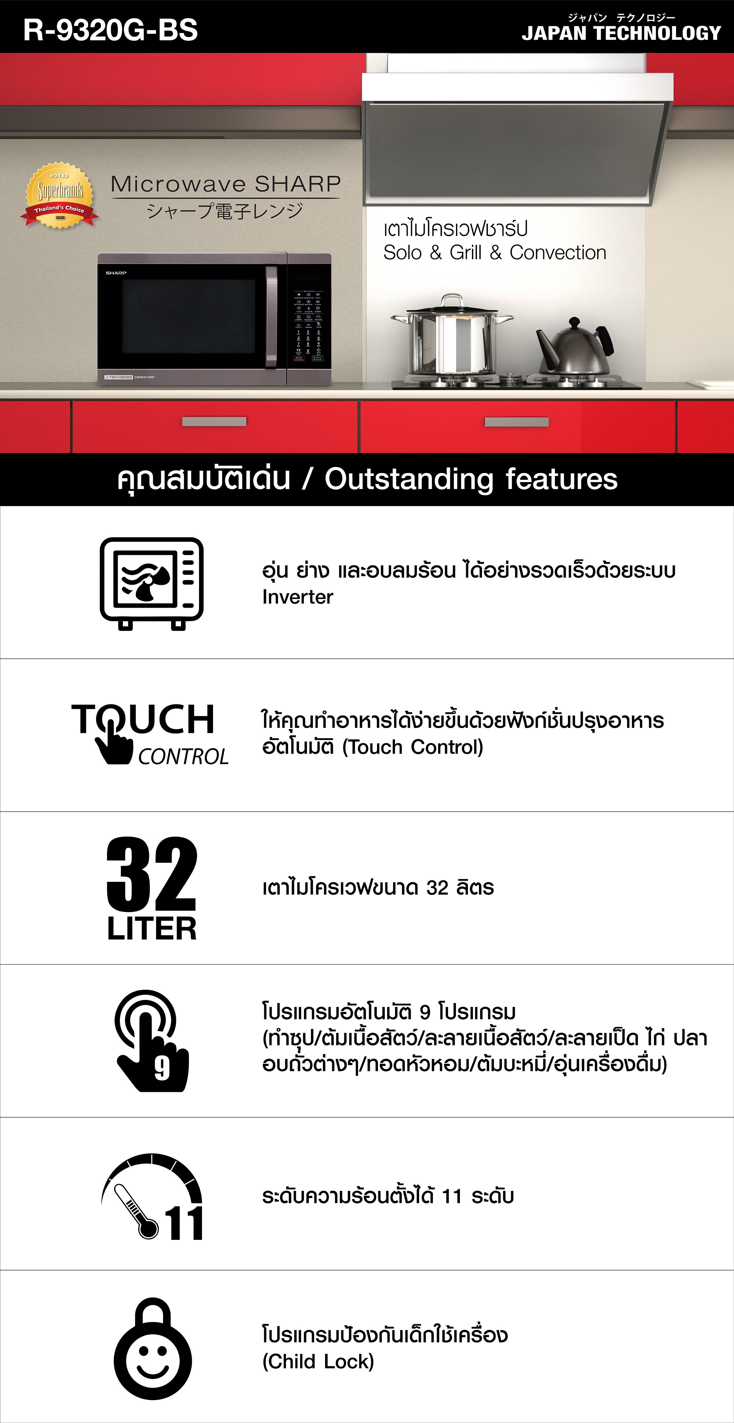 - ระบบไมโครเวฟผสมย่าง COMBI ทำให้ได้ความร้อนทั้งจากการกระจายความร้อนด้วยระบบไมโครเวฟ