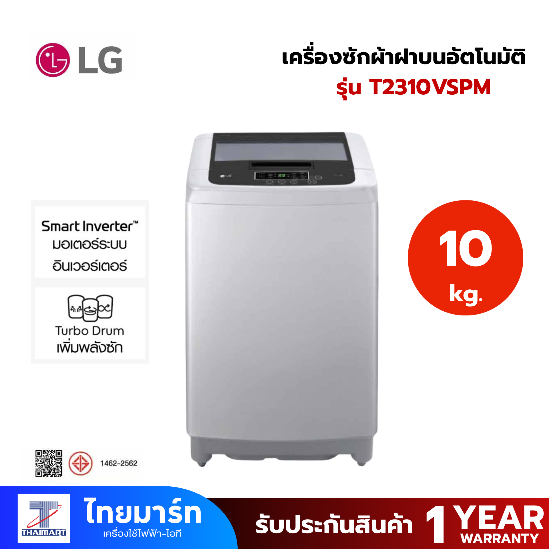 LG เครื่องซักผ้าฝาบน รุ่น T2310VSPM ระบบ Smart Inverter สีเทา ขนาดถังซัก:10 กิโลกรัม รอบปั่นหมาด:700 รอบ/นาที โปรแกรมการซัก: 8 โปรแกรม โปรแกรมซักด่วน ระบบการซักพิเศษ รับประกันมอเตอร์:10 ปี ประหยัดไฟเบอร์5 ( 2 ดาว )