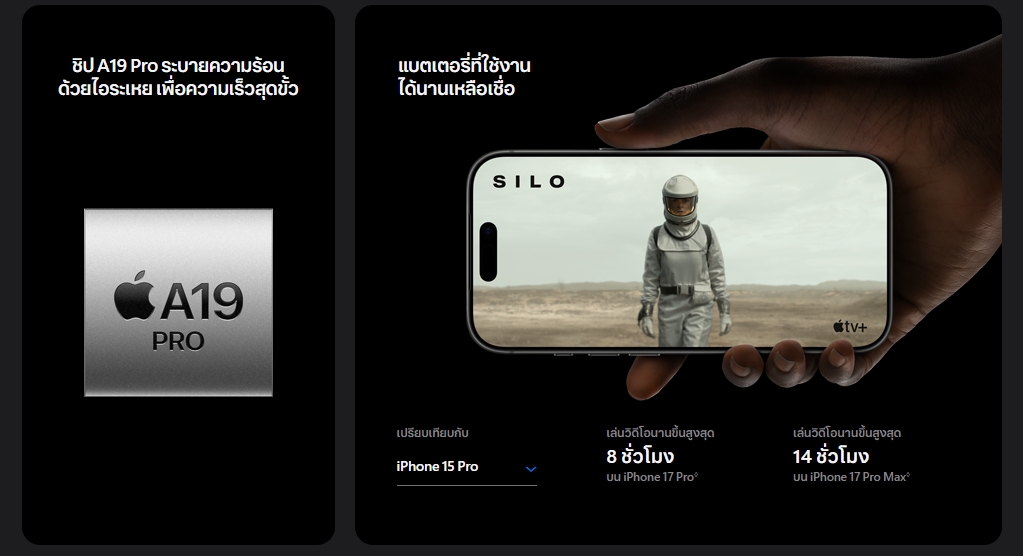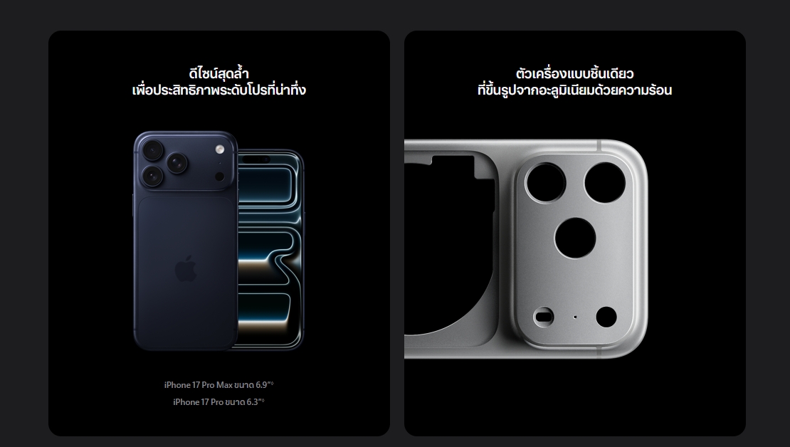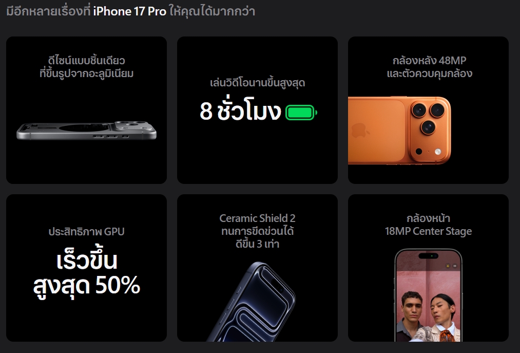 iPhone 17 Pro คือ iPhone ที่ทรงพลังที่สุดเท่าที่เคยมีมา โดยมาพร้อมจอภาพขนาด 6.3 นิ้วที่สวยสด, ดีไซน์แบบอะลูมิเนียมชิ้นเดียว, ชิป A19 Pro, กล้องหลัง 48MP ทั้งหมด และแบตเตอรี่ที่ใช้งานได้นานที่สุดเท่าที่เคยมีมา