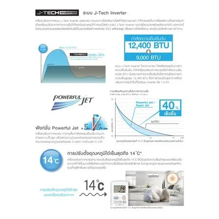 - ระบบ J-Tech Inverter ควบคุมอุณหภูมิได้อย่างแม่นยำ ลดเสียงรบกวน ประหยัดพลังงาน ทำงานควบคู่กับโหมด Eco ช่วยลดค่าไฟ