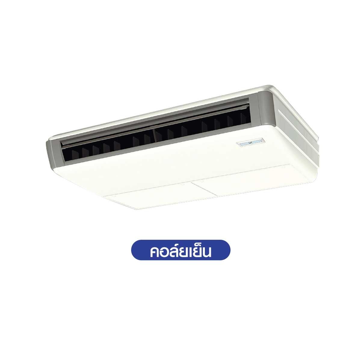 เครื่องปรับอากาศแบบแขวนใต้ฝ้า (Ceiling) ใช้สารทำความเย็น R410A ได้รับฉลากประหยัดไฟเบอร์ 5 ทุกรุ่น ให้ประสิทธิภาพการทำความเย็นสูงและไม่ทำลายชั้นบรรยากาศ กำลังลมแรง แขวนใต้ฝ้าได้สูงสุดถึง 3.5 เมตร ติดตั้งง่ายบางสุดเพียง 195 มม. ติดตั้งได้แม้ในพื้นที่แคบ ทนทานด้วยแผงระบายความร้อนที่ชุดคอยล์ร้อนเคลือบสารป้องกันการกัดกร่อน ใช้งานได้ยาวนาน