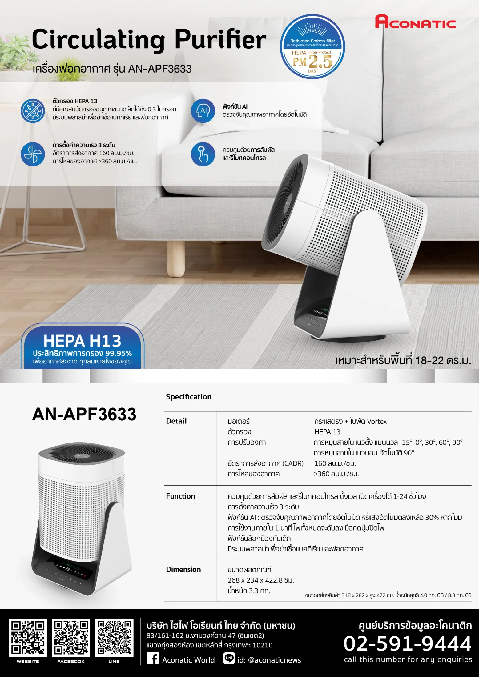 Aconatic เครื่องฟอกอากาศ รุ่น AN-APF3633 ดูแลอากาศภายในบ้านให้สะอาด ปลอดภัยต่อสุขภาพ มาพร้อม ฟิลเตอร์ HEPA 13 กำจัดฝุ่น PM2.5, แบคทีเรีย และสารก่อภูมิแพ้ ครอบคลุมพื้นที่ 15-20 ตร.ม. เหมาะสำหรับห้องนอน ห้องทำงาน หรือคอนโด มอเตอร์ DC และใบพัด Vortex ช่วยให้อากาศหมุนเวียนได้ดี อัตราการกรองอากาศ (CADR) สูงถึง 160 ลบ.ม./ชม. พร้อมฟังก์ชันอัจฉริยะ เช่น AI Auto Mode, Child Lock, Ionizer และการตั้งเวลาใช้งานได้สูงสุด 24 ชั่วโมง