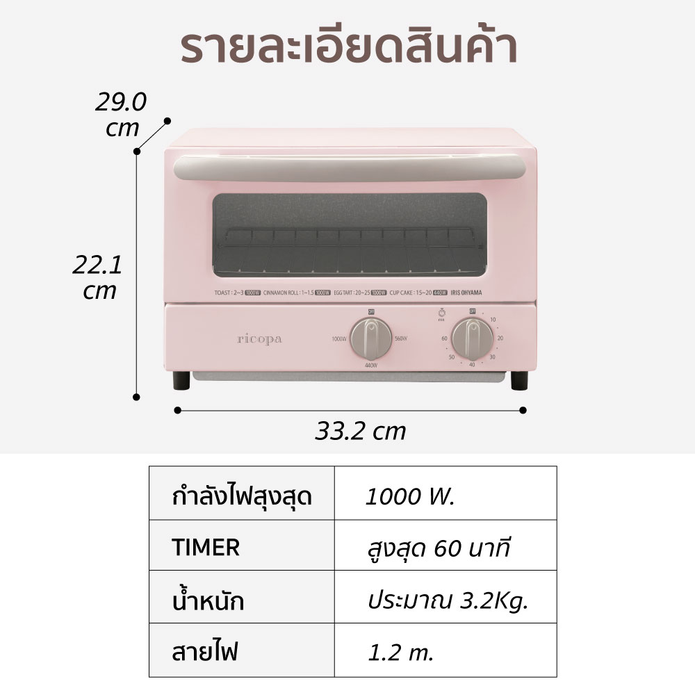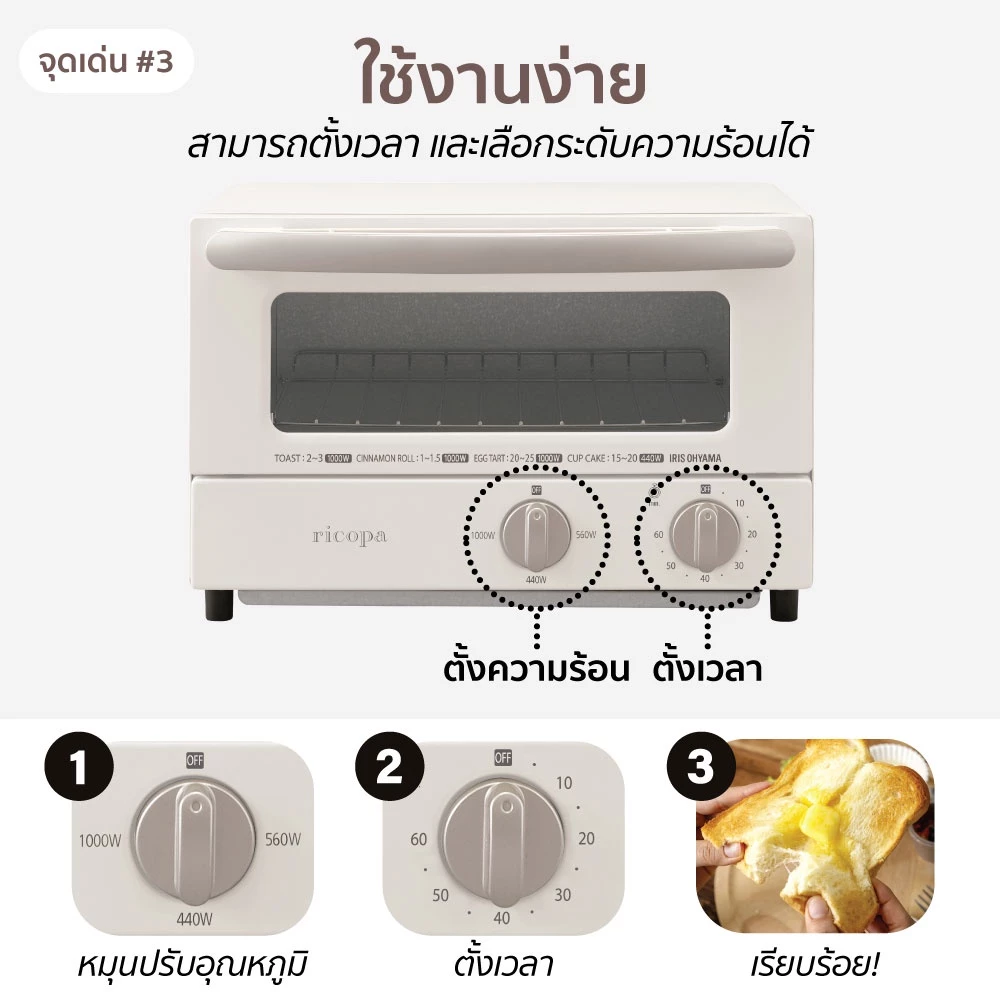 สร้างสรรค์เมนูใหม่ ๆ พร้อมสร้างบรรยากาศน่ารักและพลังงานบวกให้กับห้องครัวของคุณด้วยเตาอบ IRIS OHYAMA รุ่น EOT-R021 โดดเด่นด้วยรูปลักษณ์สไตล์วินเทจ เรโทร ควบคุมการทำงานง่ายด้วยลูกบิด พร้อมสะกดทุกสายตาด้วยโทนสีอ่อนหวานในแบบพาสเทล เหนือกว่าด้วยฟังก์ชันที่ครบครันไม่ว่าจะอบขนม คุกกี้ ขนมปัง พิซซ่า หรือแม้กระทั่งไก่อบก็สามารถทำได้ง่ายด้วยกำลงไฟ 1000 วัตต์ สามารถควบคุมไฟบน-ไฟล่างได้ตามต้องการ มาพร้อมถาดรองเศษขนมปังด้านล่างที่สามารถถอดล้างทำความสะอาดได้ คุณแม่บ้านหมดกังวลเรื่องความสกปรก อีกทั้งยังมีขนาดกะทัดรัด แต่จุได้มาก ตอบโจทย์คนพื้นที่น้อยแต่ได้ฟังก์ชันครบ