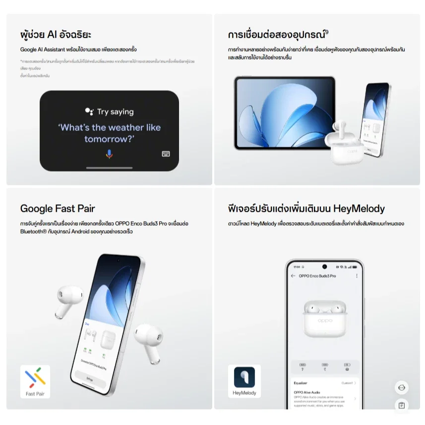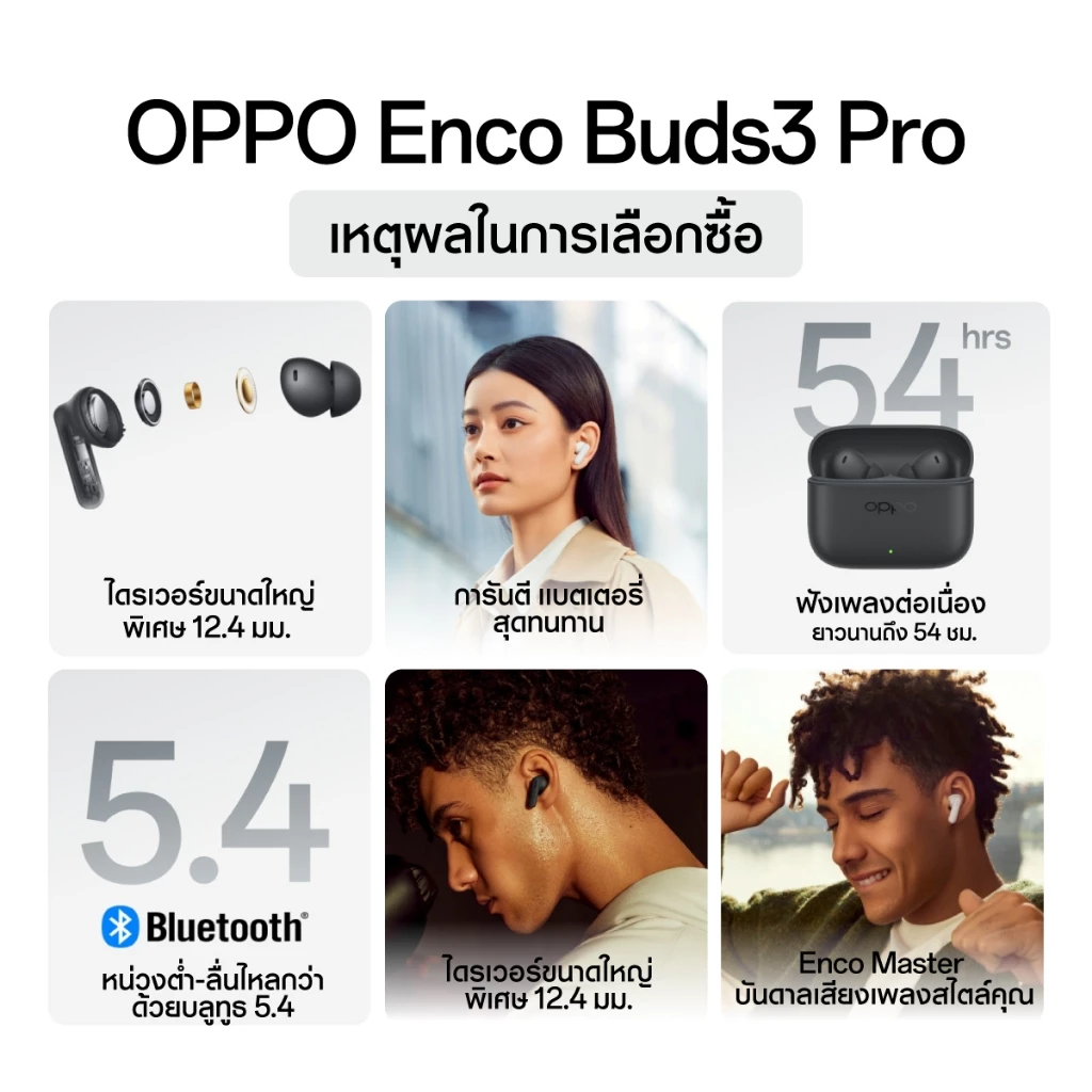 OPPO Enco Buds3 Pro  ได้รับการออกแบบมาให้มีขนาดกะทัดรัดและพกพาสะดวกยิ่งขึ้น โดยมีโครงสร้างน้ำหนักเบาที่พอดีกับหูของคุณ รับรองว่าจะสวมใส่ได้ตลอดทั้งวันโดยไม่รู้สึกอึดอัด สั่งซื้อได้แล้ววันนี้ที่ BaNANA