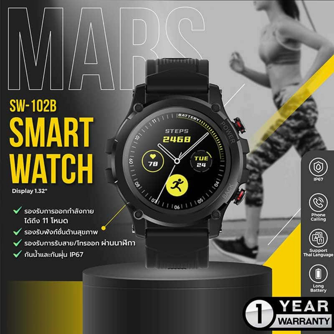 Why Mars (SW-102B) Smartwatch, modern design, large screen, clear view, easy to use, supports answering calls. Notification from smartphone and can track complete health including walking, sleeping, and heart rate Suitable for people who want a smart watch for everyday use. Both work, health and lifestyle in one house.