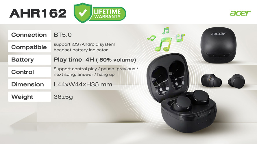 Acer AHR162 หูฟังไร้สายขนาดกะทัดรัด มาพร้อมการเชื่อมต่อ Bluetooth 5.0 ให้สัญญาณเสถียร ใช้งานง่ายด้วยระบบควบคุมสัมผัสสำหรับเล่นเพลงหรือรับสาย ตัวหูฟังน้ำหนักเบาใส่สบาย พกพาสะดวก พร้อมประสบการณ์เสียงที่ชัดเจนเหมาะสำหรับทุกกิจกรรม