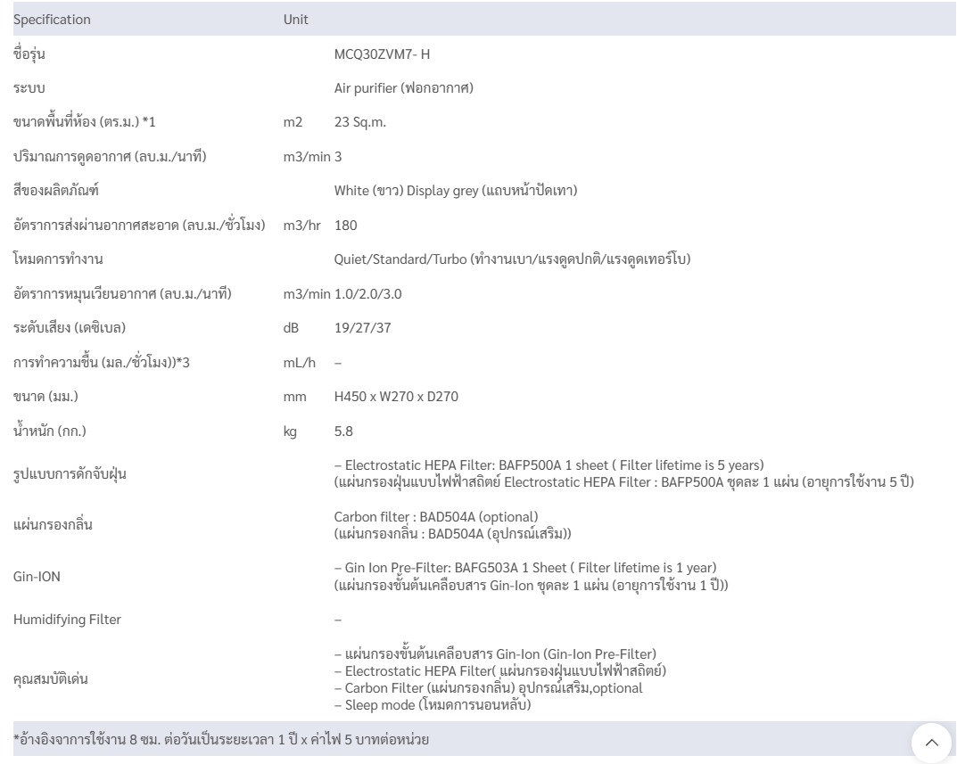 DAIKIN เครื่องฟอกอากาศ ขนาด 30 ตรม. รุ่น MCQ30ZVM7-H