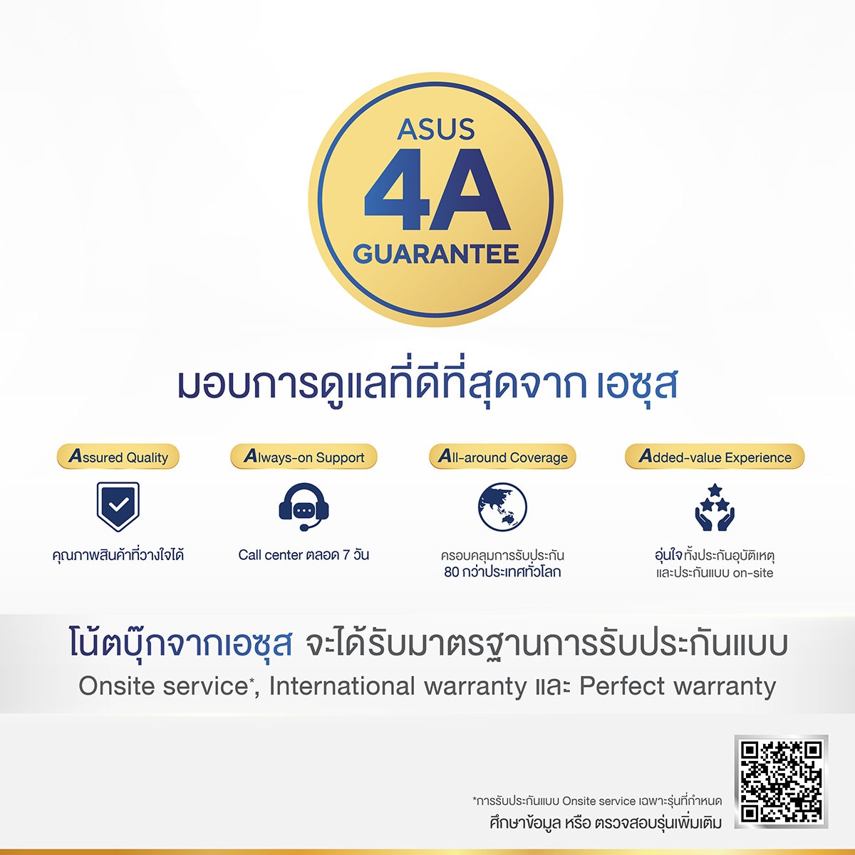 7. ภายใต้เงื่อนไขการดูแล 4A จากเอซุส ASUS Vivobook Go 15 จะได้รับการรับประกันมาตรฐาน On-Site Service 2 ปี, International warranty 2 ปีและ Perfect warranty 1 ปีแรก