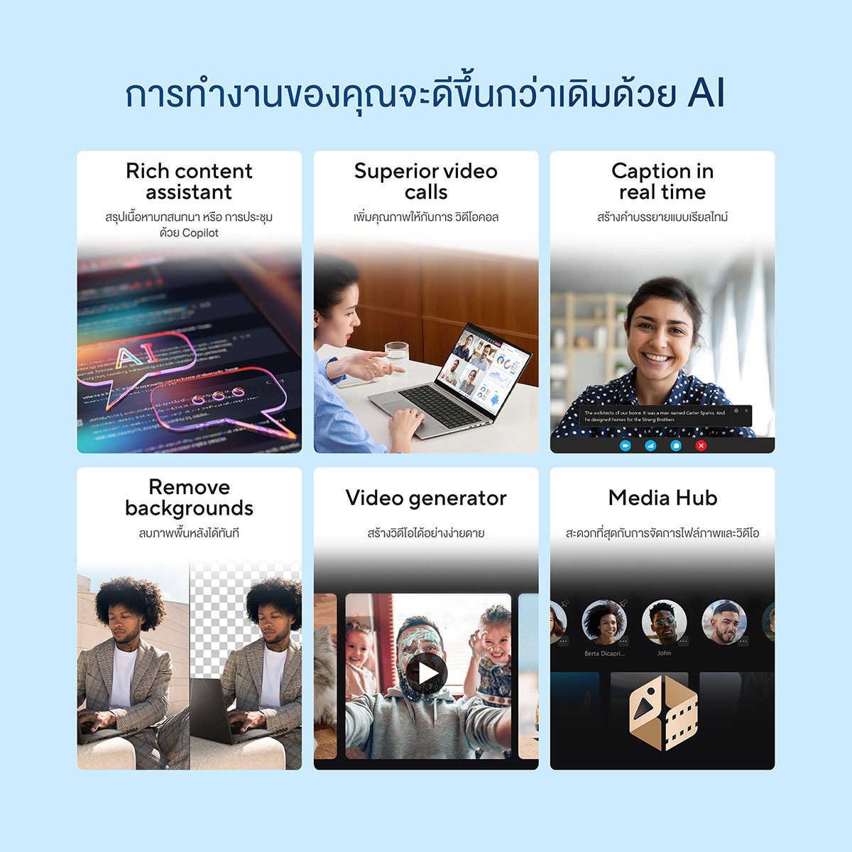 1. รุ่นนี้รองรับ Copilot+ PC มาตรฐานใหม่สำหรับ Windows 11 ที่ผสานพลังของ AI เข้ากับฮาร์ดแวร์ประสิทธิภาพสูงอย่าง CPU, GPU และ NPU (Neural Processing Unit) เพื่อรองรับการทำงานด้าน AI โดยตรงบนเครื่องโดยไม่ต้องพึ่งคลาวด์ ทำให้สามารถประมวลผลได้เร็วขึ้นถึง 5 เท่าเมื่อเทียบกับพีซีรุ่นเก่า พร้อมฟีเจอร์เด่นอย่าง Recall ที่ช่วยค้นหาข้อมูลย้อนหลัง, Cocreator สำหรับสร้างภาพด้วย AI, และ Copilot ที่ทำหน้าที่เป็นผู้ช่วยอัจฉริยะในการเขียน สรุปข้อมูล และวางแผนงาน—ผ่านปุ่ม Copilot บนคีย์บอร์ดโดยเฉพาะ ทั้งหมดนี้ช่วยให้การทำงานและความคิดสร้างสรรค์เป็นไปอย่างลื่นไหลและมีประสิทธิภาพสูงสุด