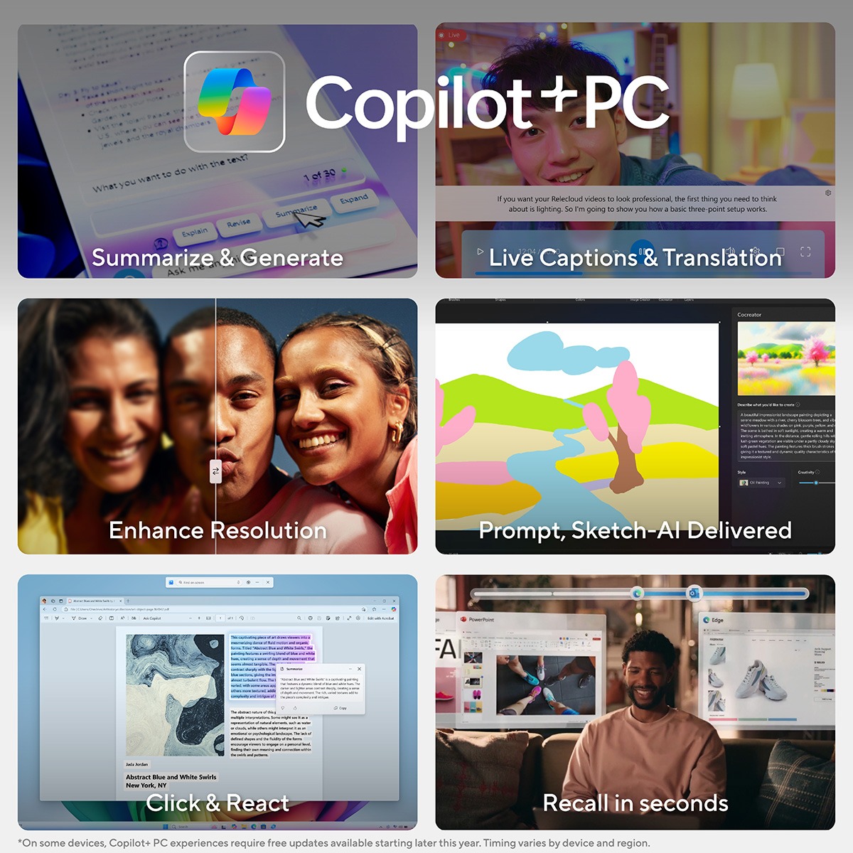 รองรับ Copilot+ PC มาตรฐานใหม่สำหรับ Windows 11 ที่ผสานพลังของ AI เข้ากับฮาร์ดแวร์ประสิทธิภาพสูงอย่าง CPU, GPU และ NPU (Neural Processing Unit) เพื่อรองรับการทำงานด้าน AI โดยตรงบนเครื่องโดยไม่ต้องพึ่งคลาวด์ ทำให้สามารถประมวลผลได้เร็วขึ้นถึง 5 เท่าเมื่อเทียบกับพีซีรุ่นเก่า พร้อมฟีเจอร์เด่นอย่าง Recall ที่ช่วยค้นหาข้อมูลย้อนหลัง, Cocreator สำหรับสร้างภาพด้วย AI, และ Copilot ที่ทำหน้าที่เป็นผู้ช่วยอัจฉริยะในการเขียน สรุปข้อมูล และวางแผนงาน—ผ่านปุ่ม Copilot บนคีย์บอร์ดโดยเฉพาะ ทั้งหมดนี้ช่วยให้การทำงานและความคิดสร้างสรรค์เป็นไปอย่างลื่นไหลและมีประสิทธิภาพสูงสุด