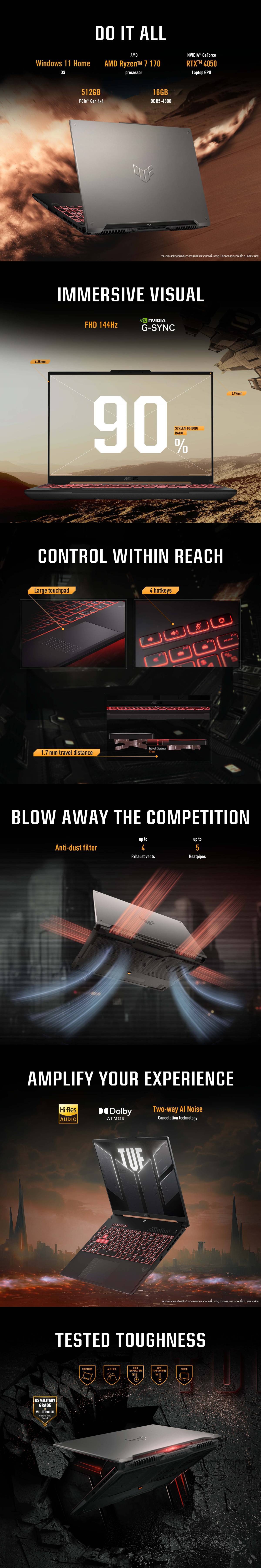Asus TUF Gaming A16 FA607NUQ-RL009W ขุมพลัง AMD Ryzen 7 จับคู่ NVIDIA GeForce RTX 40 Series มอบประสิทธิภาพลื่นไหลทั้งเกม AAA และงานกราฟิก DDR5 เร็วแรง พร้อมระบบระบายความร้อน Self-Cleaning 2.0 แบตอึดชาร์จไว ตัวเครื่องทนทานมาตรฐานกองทัพสหรัฐฯ รองรับ Wi-Fi 6 และเสียง 7.1 Surround พร้อม AI Noise Cancelation