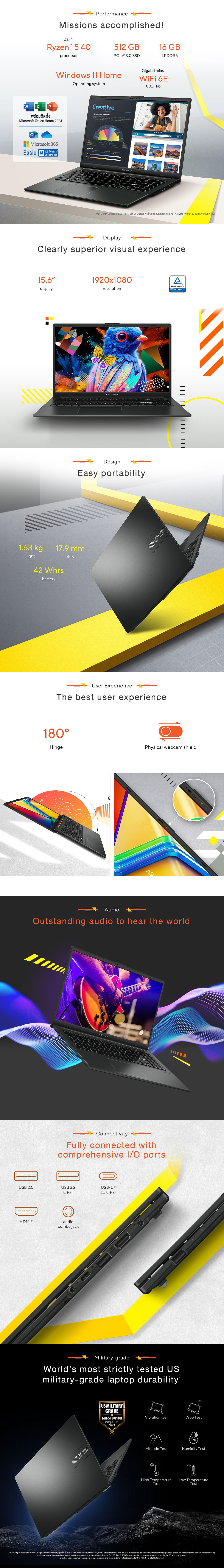 Asus Vivobook Go 15 โดดเด่นด้วยดีไซน์บางเบาเพียง 17.9 มม. น้ำหนัก 1.63 กก. พกพาสะดวก หน้าจอ 15.6 นิ้ว FHD ขอบบาง มุมมองกว้าง พร้อมการรับรองถนอมสายตาจาก TÜV Rheinland แข็งแรงผ่านมาตรฐาน US MIL-STD-810H และบานพับกางได้ 180° เหมาะทั้งเรียน ทำงาน และใช้งานทุกวัน พร้อม Windows 11 และ Office