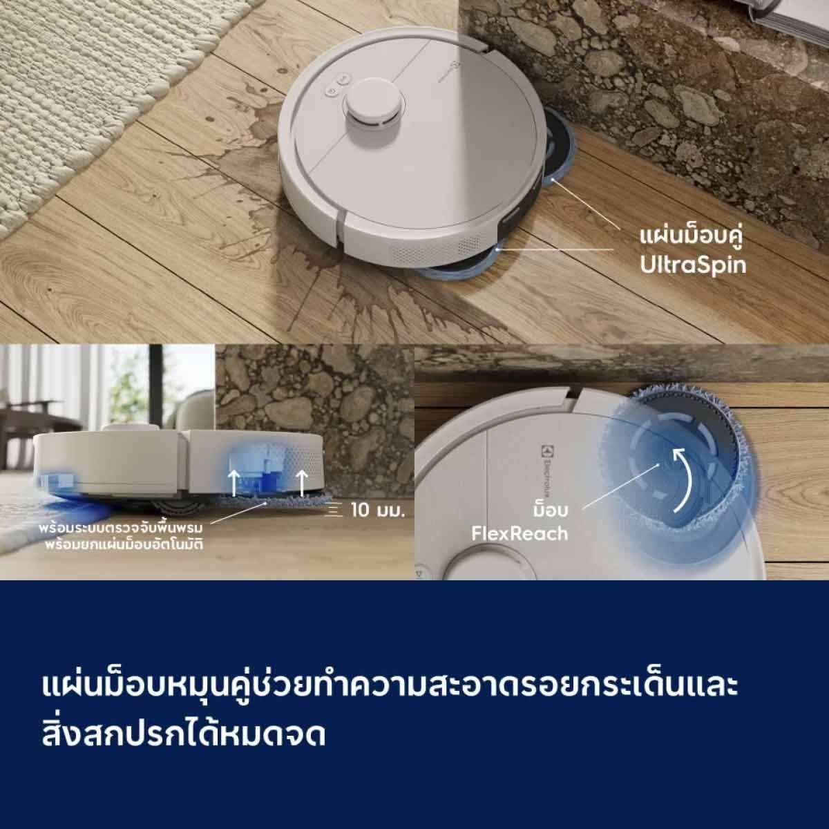 ELECTROLUX เครื่องดูดฝุ่นหุ่นยนต์+แท่นWifi รุ่นEFR81223 พลังดูดไซโคลน 7,000 พาสคาล แท่นชาร์จ กำลังไฟ 650 วัตต์ ความจุขนาด 4,800mAh สามารทำงานสูงสุด 208 นาที ม็อบถูพื้นแบบหมุน 180 rpm พร้อมแขนยืดขยาย