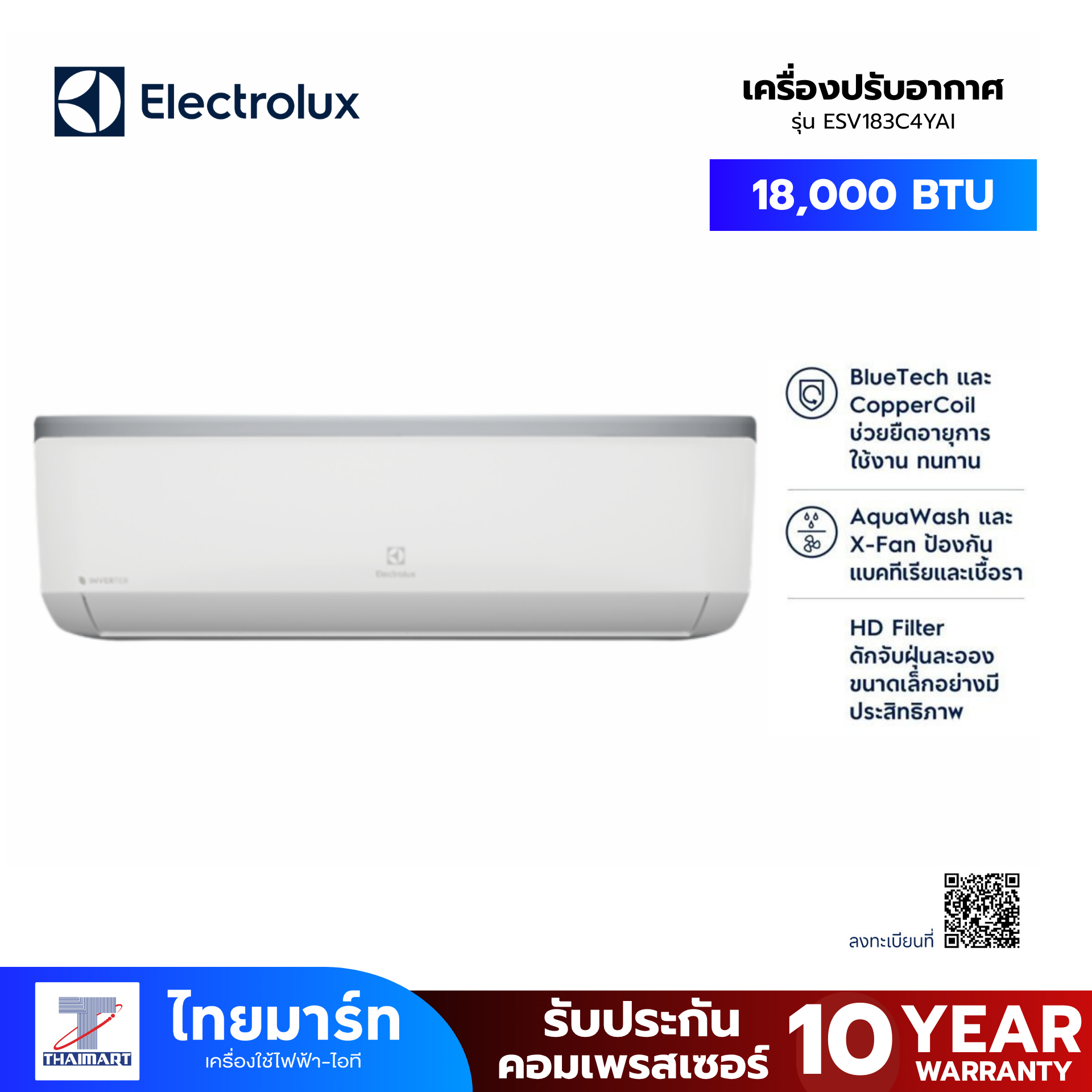 เครื่องปรับอากาศอินเวอร์เตอร์ ยี่ห้อ Electrolux รุ่น ESV183C4YAI 18000 BTU (เครื่องศูนย์ไทย รับประกัน 2ปี)